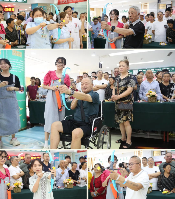 射箭区内,在工作人员的指导下,医护人员、患者及其家属们,纷纷体验了一把拉弓射箭的乐趣。瞄准靶心,箭矢如虹,展现勇者英姿。