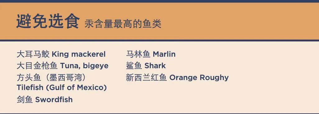 含汞较多的掠食性鱼类有鲸、鲨鱼、旗鱼、鲭鱼等;不过除了某些以海鲜为主要食物来源的地区外,一般人也很少能吃到这些野生鱼类,且每周食用2~3份低汞含量鱼仍然是安全的。下面来看看美国自然资源保护协会列举的含汞量较高的鱼类及相关建议: